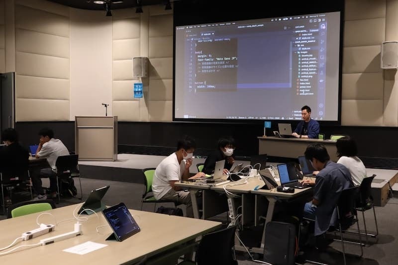 会場は、情報通信交流館 e-とぴあ・かがわにて実施しました。会場のスクリーンだけでなく、手元に置かれたiPadにて講師のコードを確認することができます。