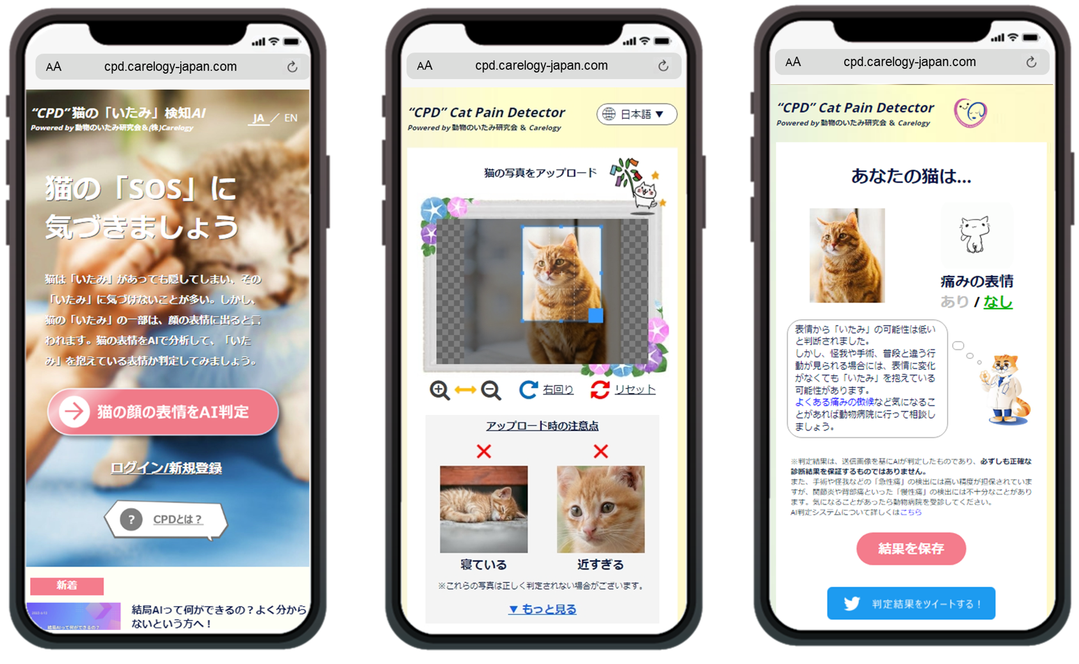 猫の顔写真をアップロードするだけで、AIがその猫の表情を分析し、痛がっている顔をしているかどうかを判定してくれる無料のWebサービスとなっております。