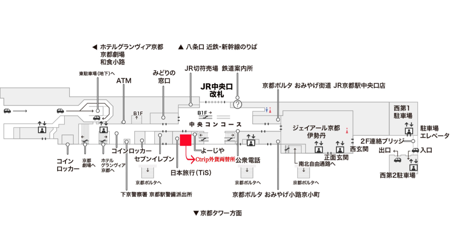 ・設置場所:京都駅1F中央口改札前 日本旅行TiS京都支店内(京都タワー側、駅前広場)(下図参照)