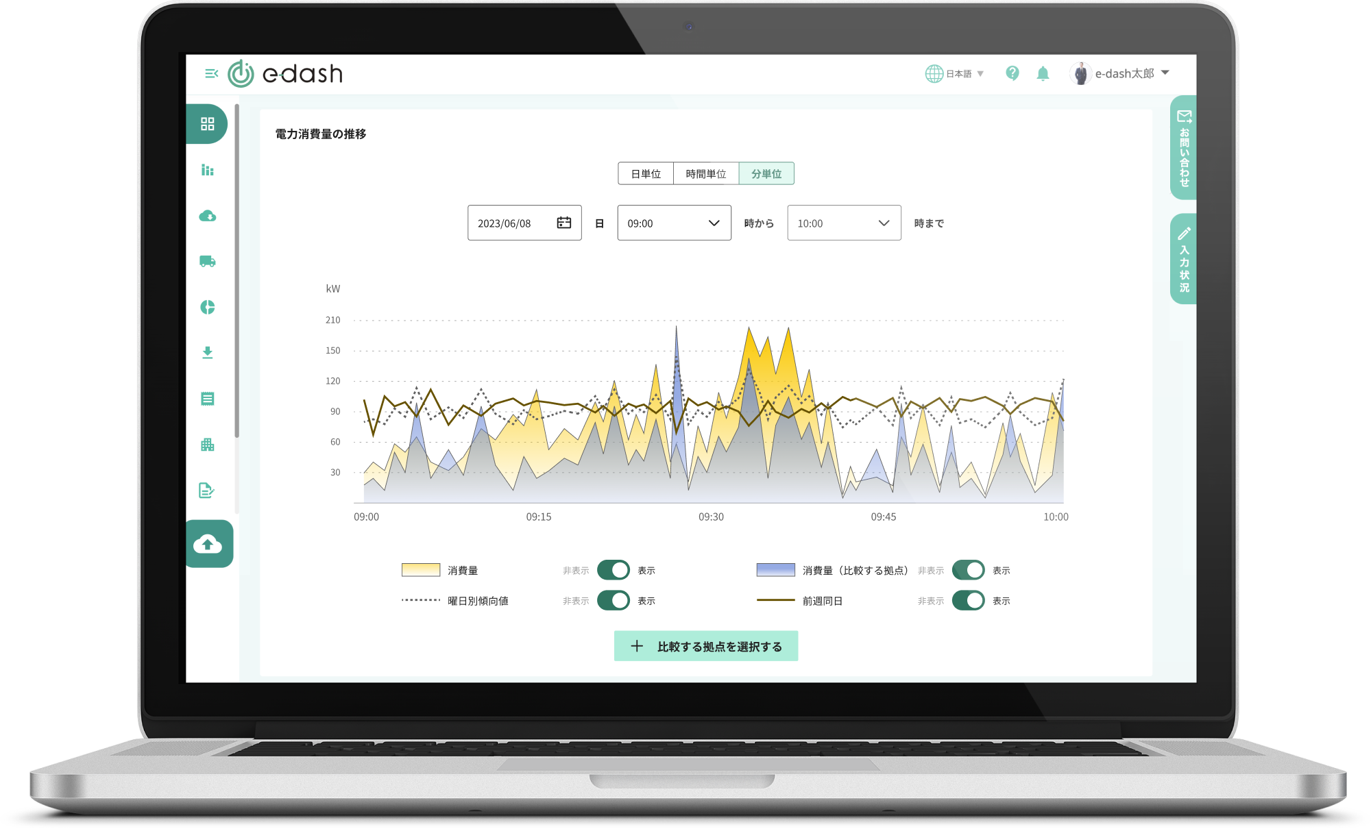 そこで当社は、「e-dash」への追加機能として、デバイスの設置により分単位でのリアルタイムデータの可視化が叶う「e-dash real-time」を開発したことを発表します。この機能により、曜日別、時間帯別、拠点別、回路別などお客様の希望に応じ様々な視点で電力消費量を可視化することができます。可視化された情報は、オペレーションの見直しによる最大需要電力のコントロールと電力コストの削減、省エネ施策のより具体的な検討と実施時の効果測定、さらには細分化されたデータを活用した精緻なカーボンフットプリントの算出に取り組んでいただくことができます。