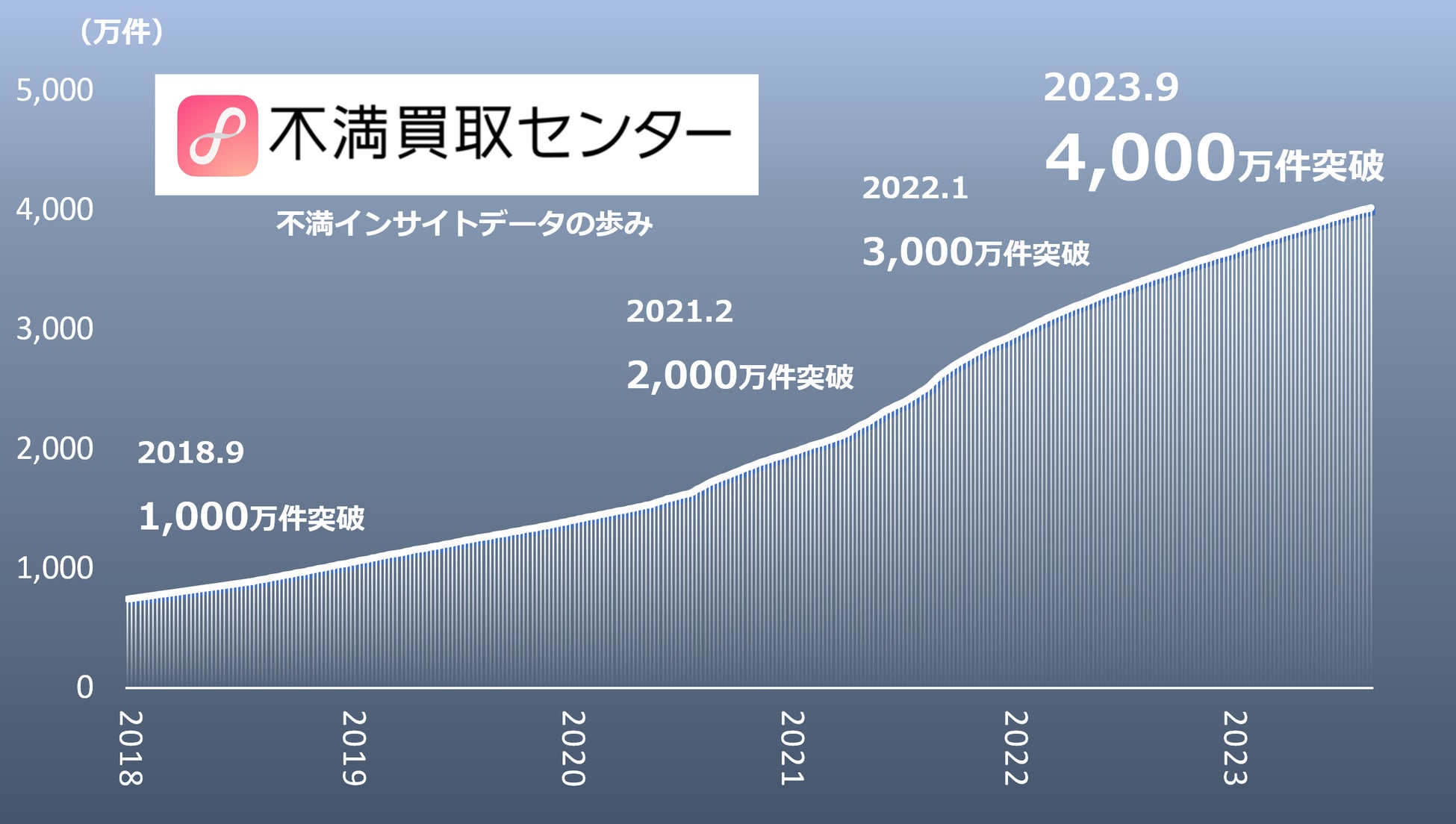 「不満買取センター」が蓄積する不満インサイトデータは2021年2月に2,000万件を突破しました。それ以降、多くのイベントやメディアでご紹介の機会を頂き、新たな会員をお迎えした結果、2,000万件突破から1年にあたる2022年1月に累積3,000万件を突破しました。その後、安定的に不満ビッグデータを多くの会員から投稿頂いており、この2023年9月に4,000万件を突破しました。