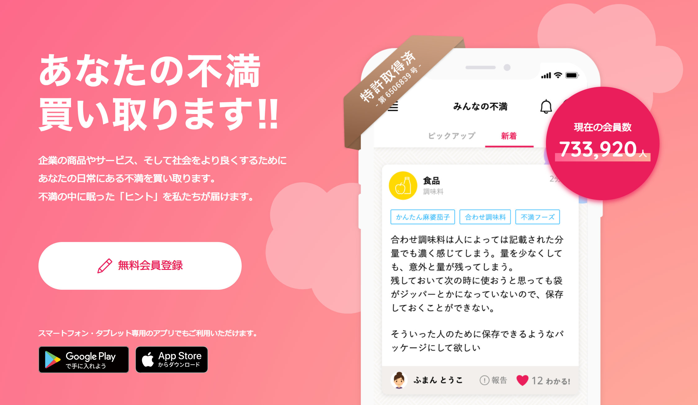 Webサービス及びスマートフォンアプリを通して生活者からの不満の声を収集しており、現在累計73万人以上の会員から不満を買い取っています。