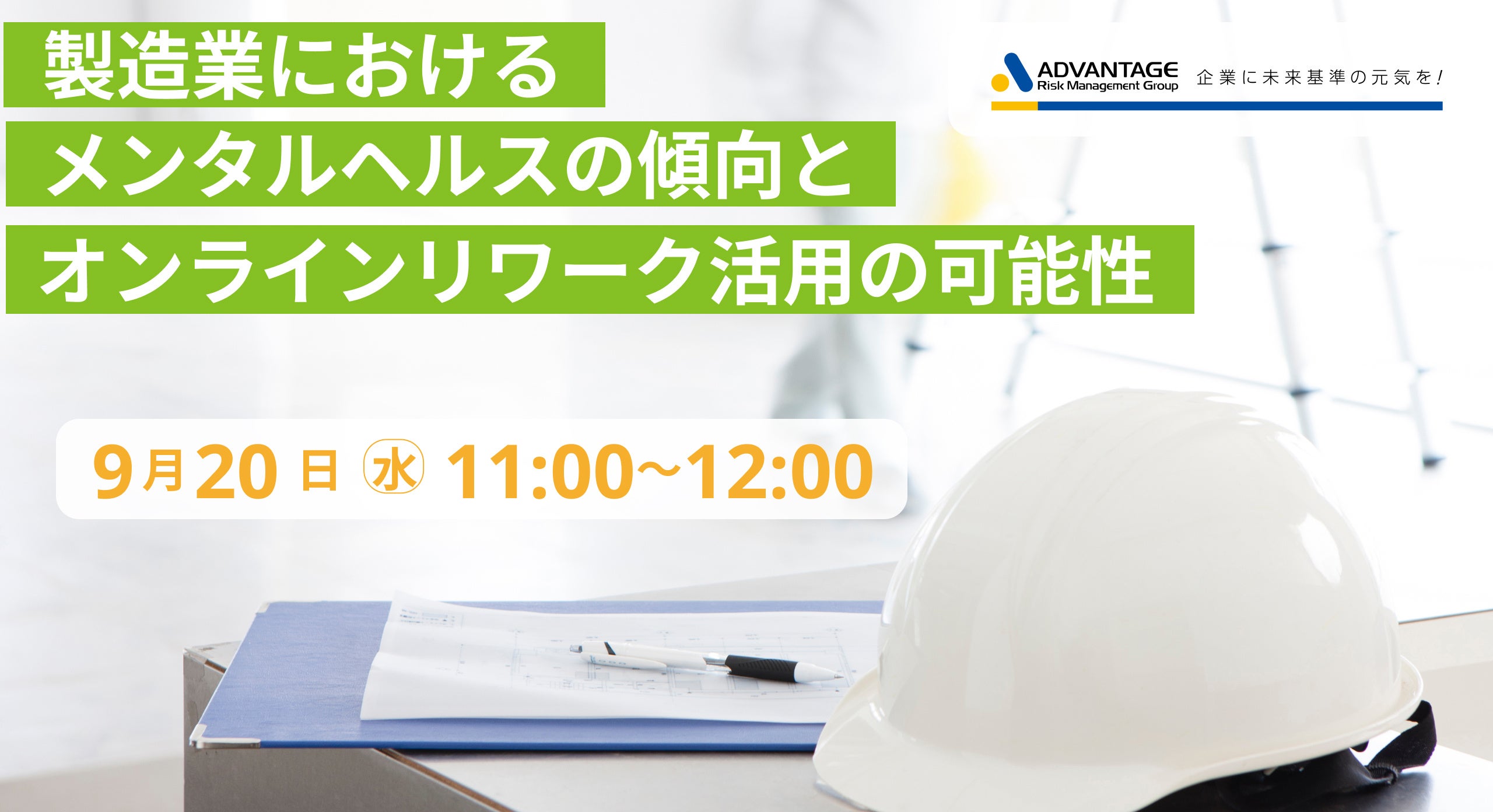 株式会社アドバンテッジリスクマネジメントは、製造業の人事担当者様、産業保健スタッフ様を対象に、「製造業におけるメンタルヘルスの傾向とオンラインリワーク活用の可能性」に関する無料セミナーを開催することが決定いたしましたのでお知らせいたします。