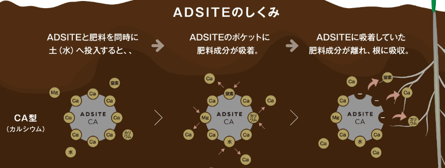 ADSITEの特許技術は、新手法による生産効率UPやコストダウン、さらに保肥性能UPさせたものとなり、保肥性能の指標である陽イオン交換容量(CEC)が220cmol/kgあり、一般の天然ゼオライトの約3倍、従来製法の1.7倍にもなります。
