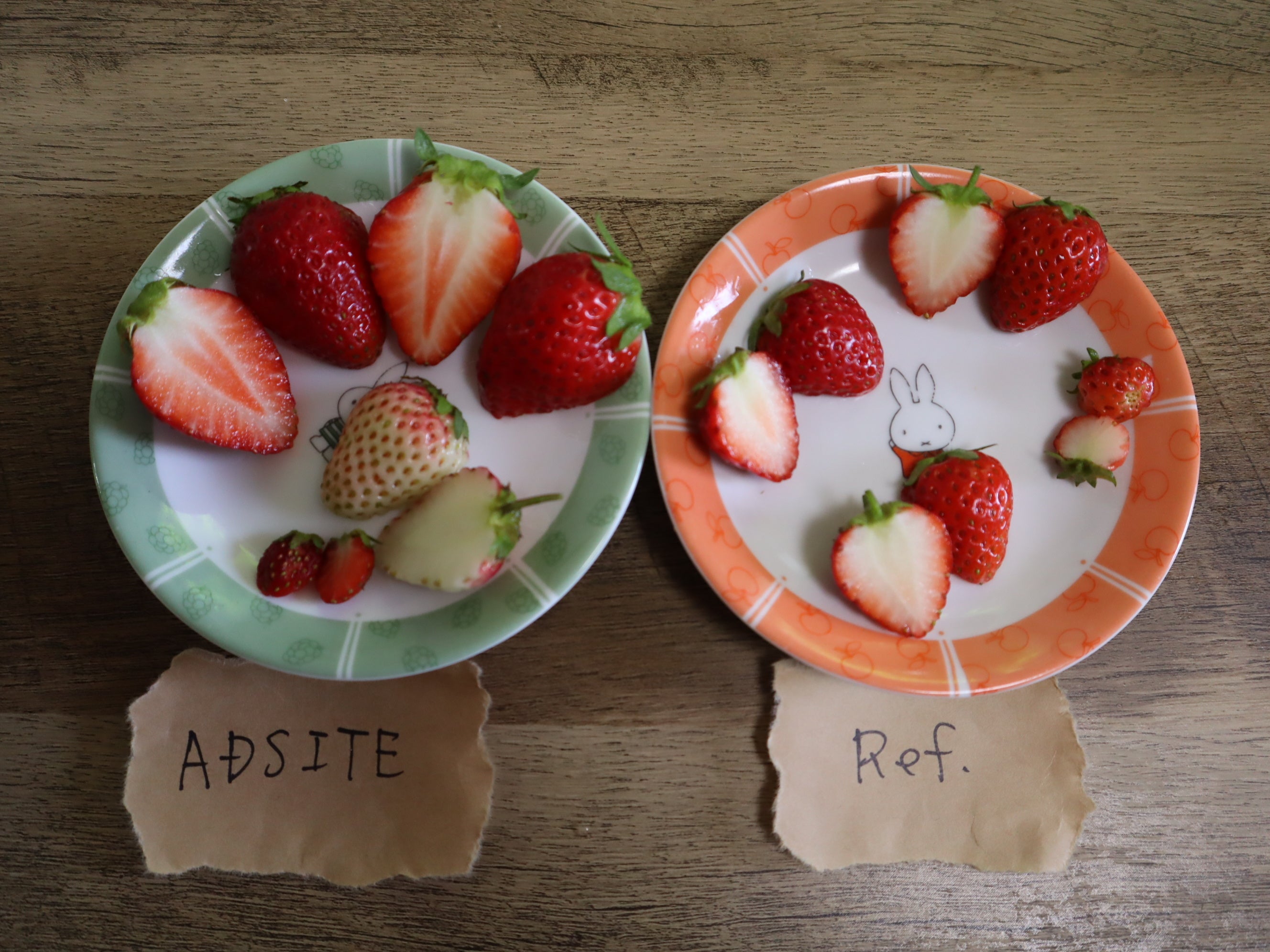 ※ADSITE MGを混ぜた土で育てたイチゴ(左のイチゴ)は、比較対象のイチゴ(右のイチゴ)と比べて、中身が赤い。これは目にも良い抗酸化作用のある美容にもうれしいアントシアニン色素が豊富なことが分かります。