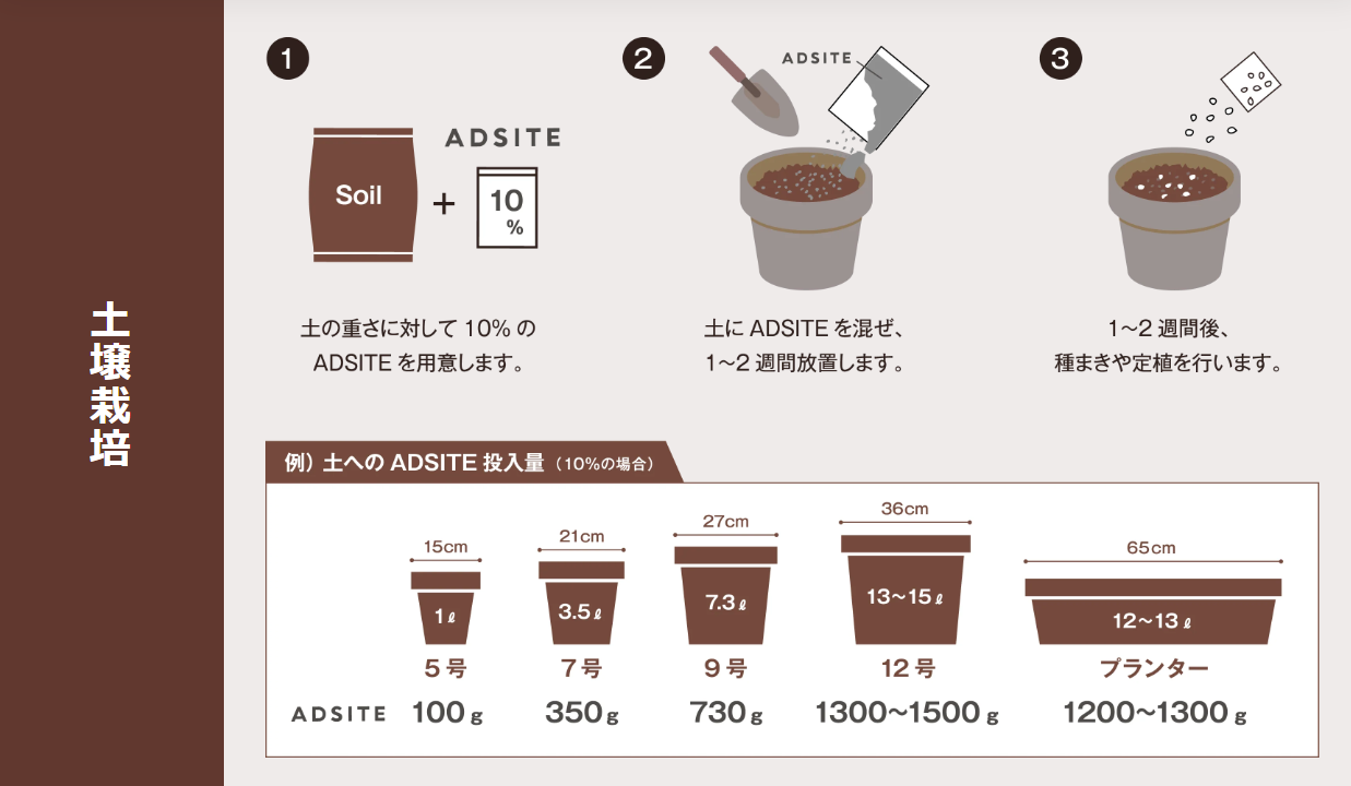 土の量に対して、自分好みにブレンドしたADSITEを約10%用意し、土に混ぜます。