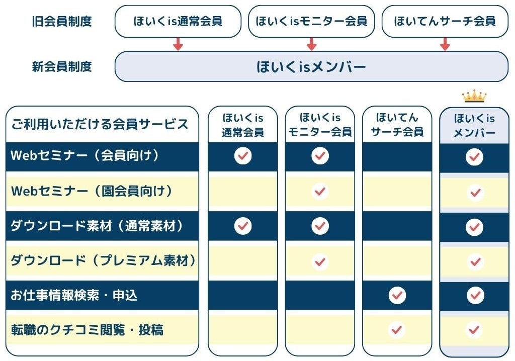 ほいくisの従来の個人向け会員サービスには「通常会員」と「モニター会員」の2種類があり、それぞれ利用できるサービスの範囲が異なっていました。今回スタートした、「ほいくisメンバー」制度では、会員サービスは1つになり、全てのサービスを制限なく無料でご利用いただけるようになりました。メンバー登録も無料ですので、登録・サービス利用に際して料金が発生することはありません。