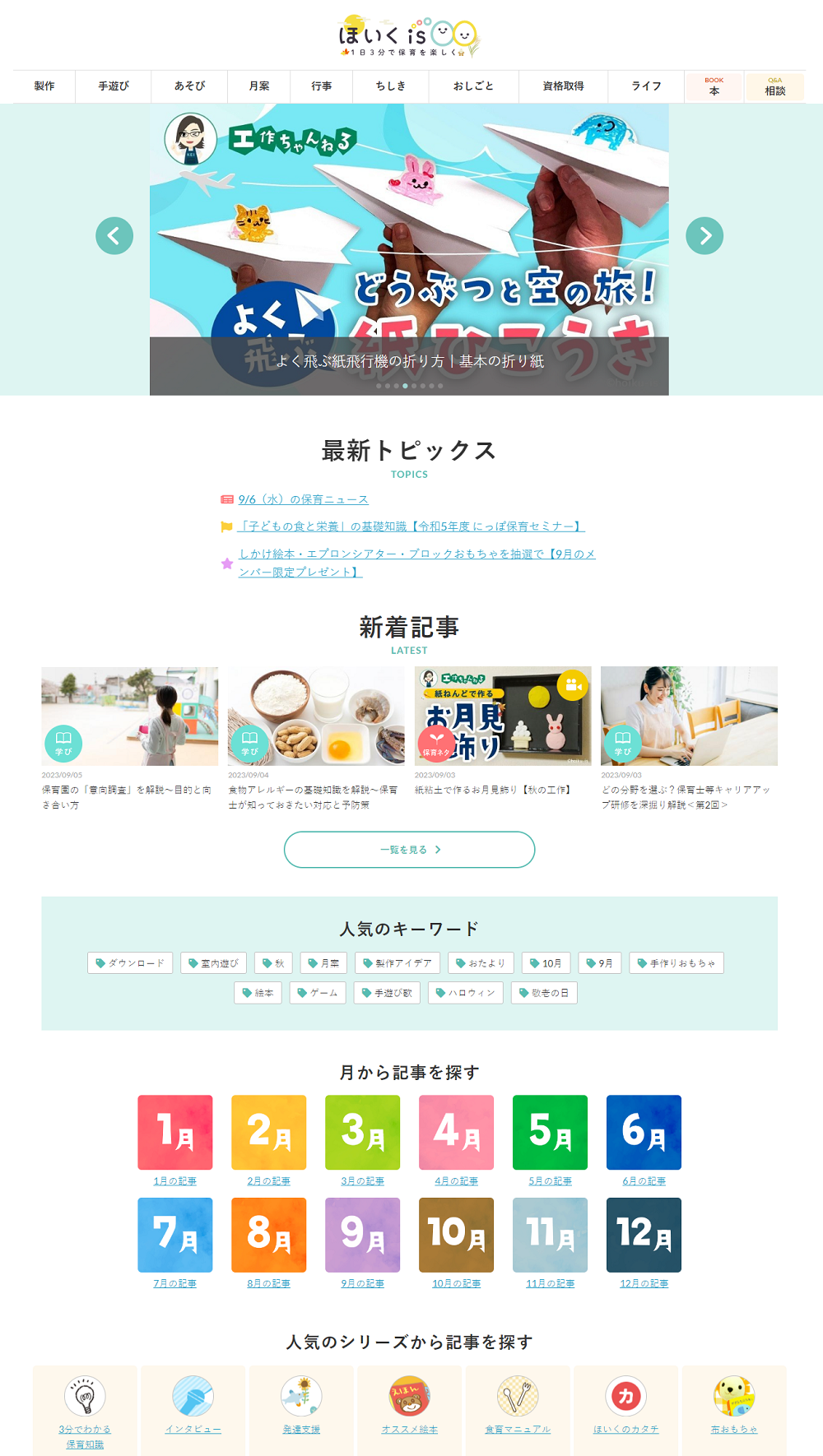 毎日の保育に役立つ情報をコンパクトに配信する、保育士・幼稚園教諭向け総合メディア。2019年7月のオープン以来、保育に関わる全ての方に向けて365日情報を発信。月間50万ユーザーと、業界トップクラスの利用数を誇る急成長中の情報サイトです。