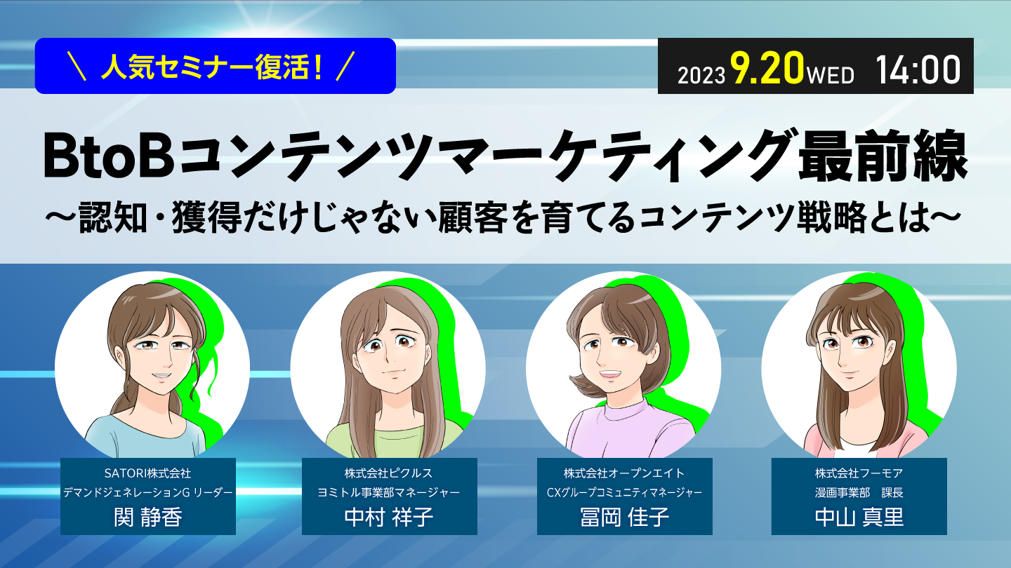 本セミナーでは、コンテンツ制作に強い「オープンエイト」「ピクルス」「フーモア」の3社とコンテンツをMAで活用する「SATORI」の計4社が、認知獲得~顧客育成まで、コンテンツマーケティングの基本戦略をお伝えします。
