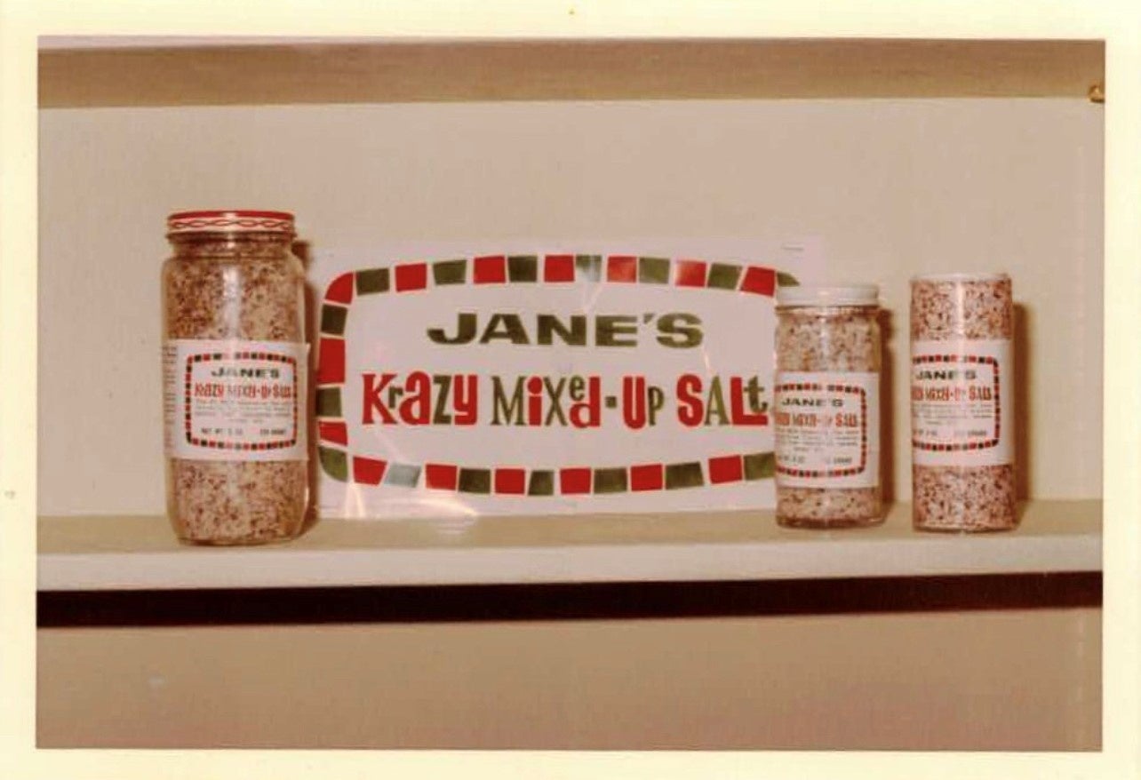 『クレイジーソルト』は、1960年代のアメリカ・フィラデルフィアに住む主婦、ジェーンおばさんのキッチンで誕生しました。ひと振りでかんたんにおいしい料理が出来るシーズニングが欲しいと考えたジェーンおばさんは、別々に使っていた岩塩やハーブを一緒のボトルに入れることを思いつきました。こうして、ジェーンおばさんが一番おいしいと思う割合で素材を絶妙にブレンドしたシーズニング、クレイジーソルトが誕生しました。