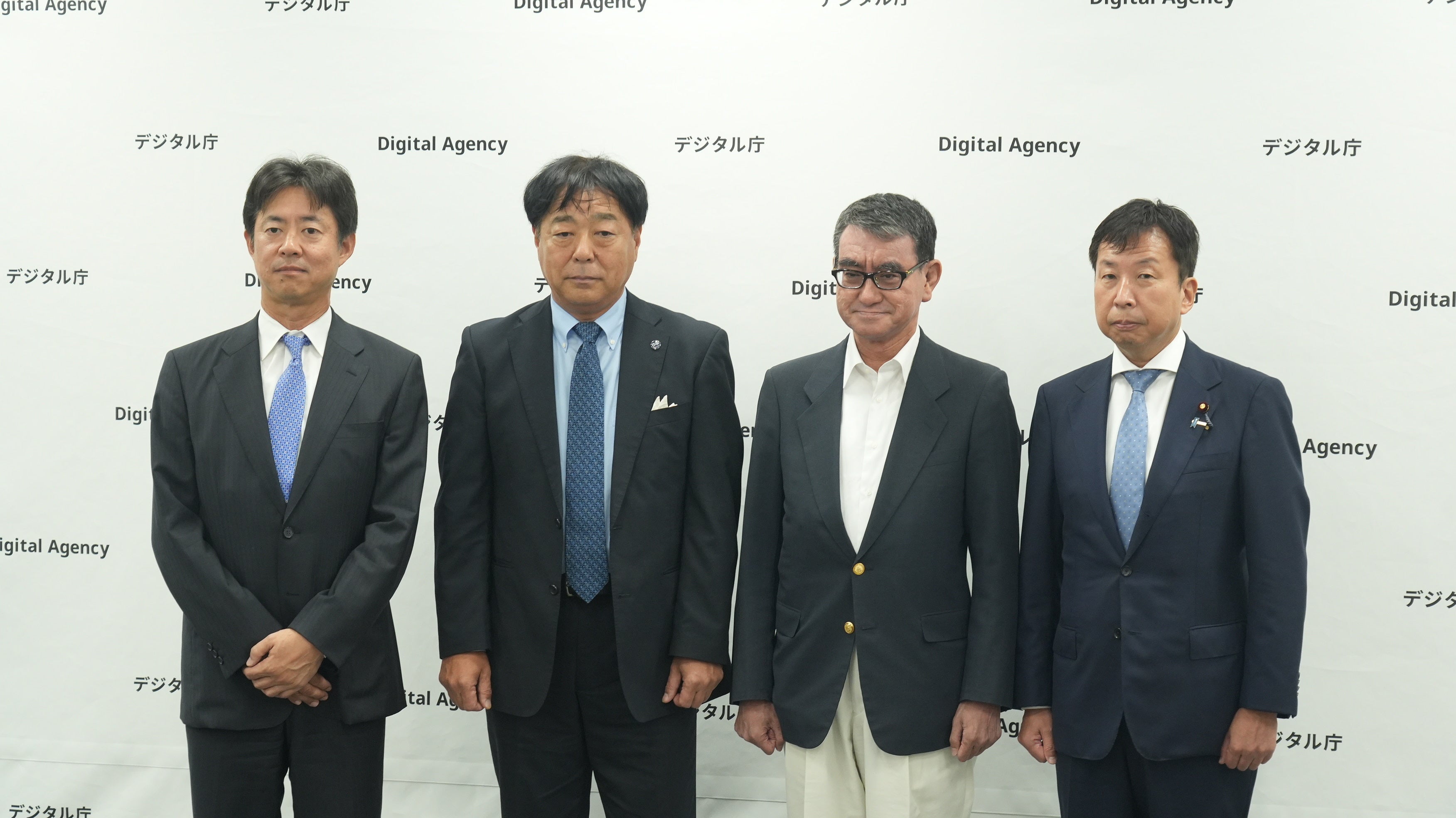 (写真左から、株式会社ドリームインキュベータ 代表取締役社長 三宅孝之、ぴあ株式会社 取締役 東出 隆幸氏、デジタル庁 デジタル大臣 河野 太郎氏、デジタル庁 デジタル副大臣 大串 正樹氏)