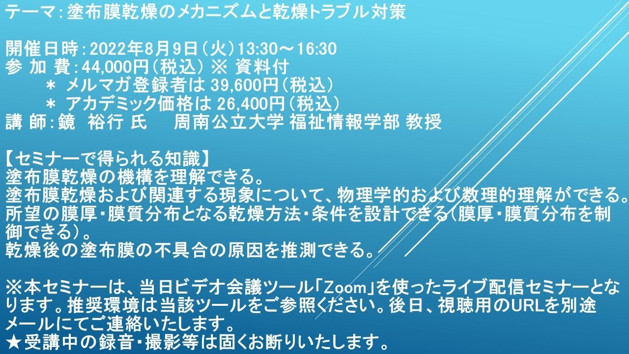 ※ 本セミナーは、当日ビデオ会議ツール「Zoom」を使ったライブ配信セミナーとなります。推奨環境は当該ツールをご参照ください。後日、視聴用のURLを別途メールにてご連絡いたします。