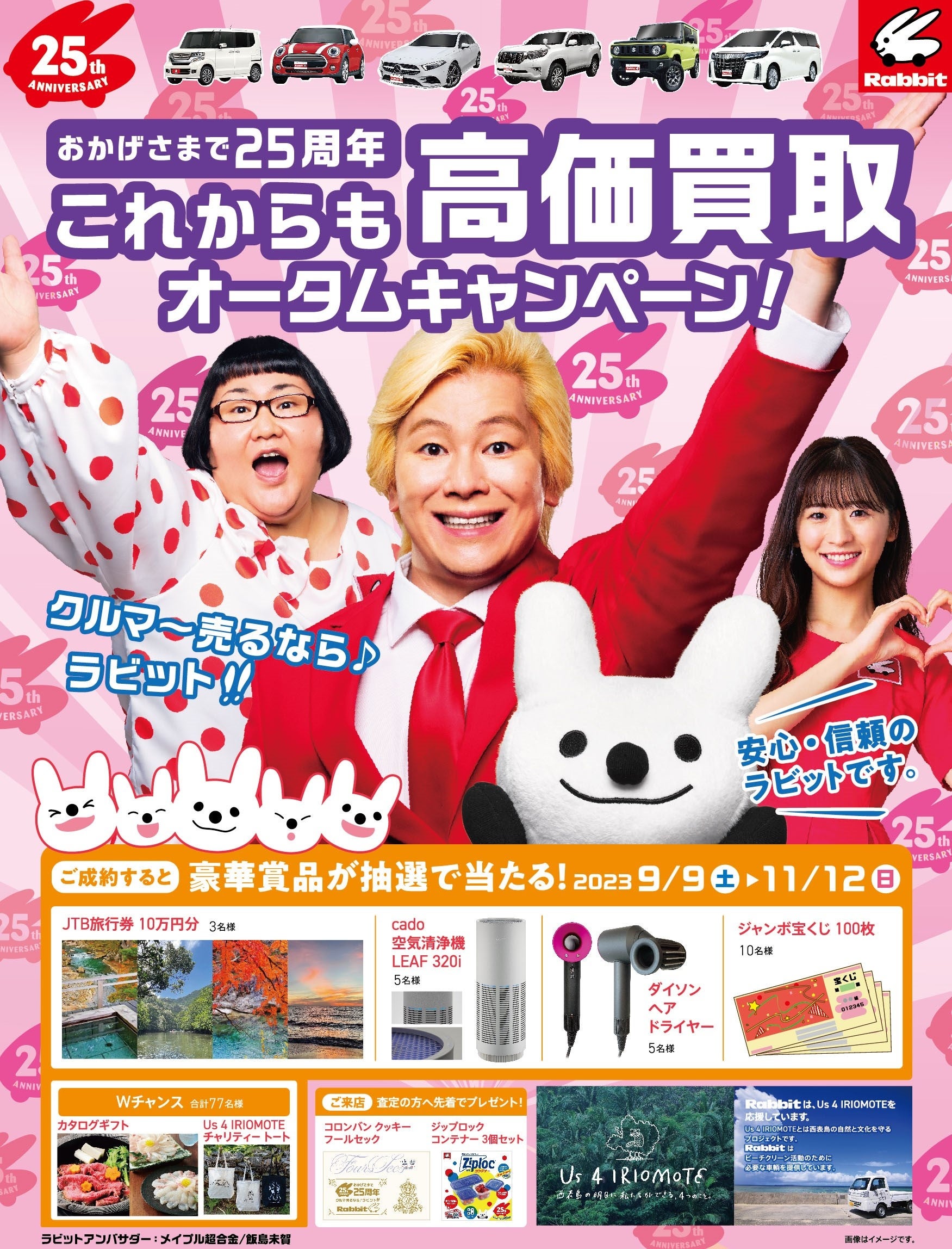 株式会社ラビット ・カーネットワーク(本社:東京都 江戸川区臨海町 、代表取締役社長:小島 演)が運営する自動車買取・販売の「ラビット」では、『おかげさまで25周年これからも高価買取オータムキャンペーン!』を実施しております 。