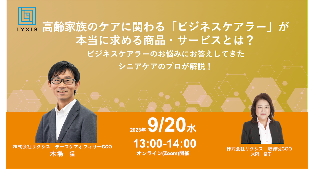 そこで今回のセミナーでは、ビジネスケアラーたちが今何に困り、どんな商品・サービスを求めているのかを、多くのビジネスケアラーのお悩みにお答えしてきたリクシスならではの視点でご紹介いたします。
