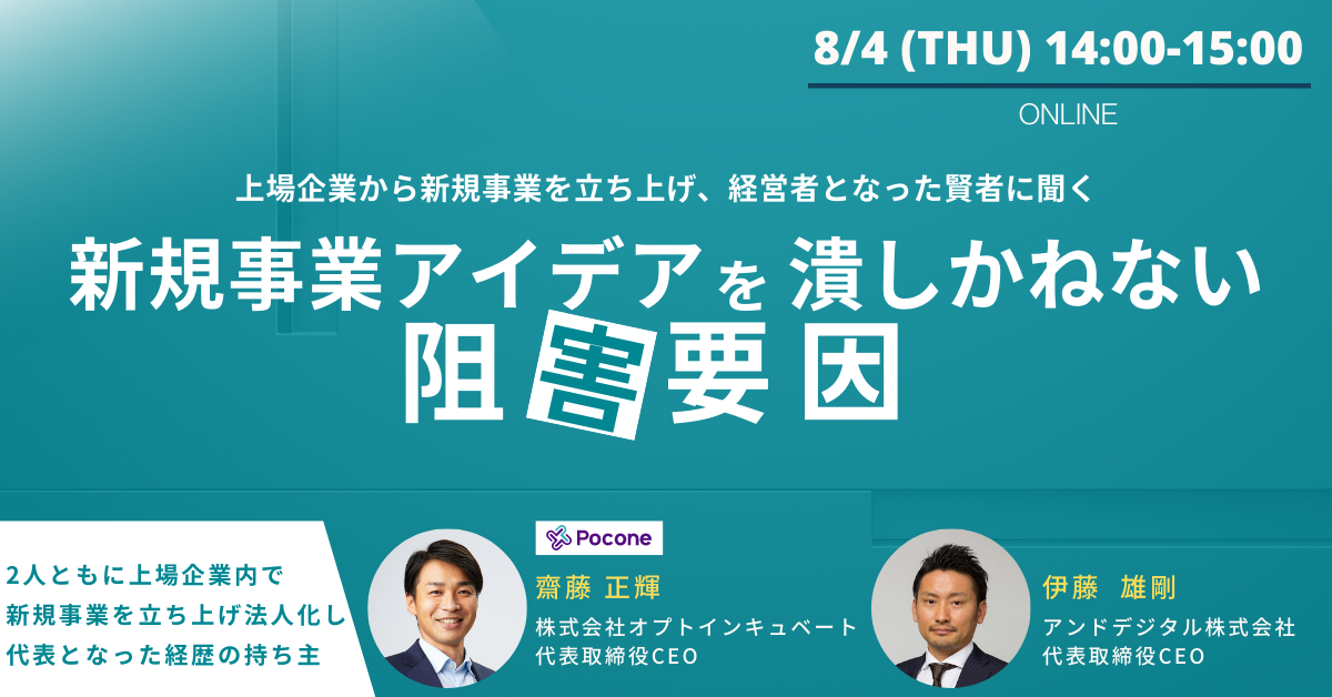 本ウェビナーでは、デジタルホールディングスグループで数々の新規事業を成功へと導いてきたオプトインキュベート社CEOの齋藤氏と、ソウルドアウトグループで主要事業管掌役員から新規事業の立ち上げを行ったアンドデジタル社CEOの伊藤氏の対談を行います。