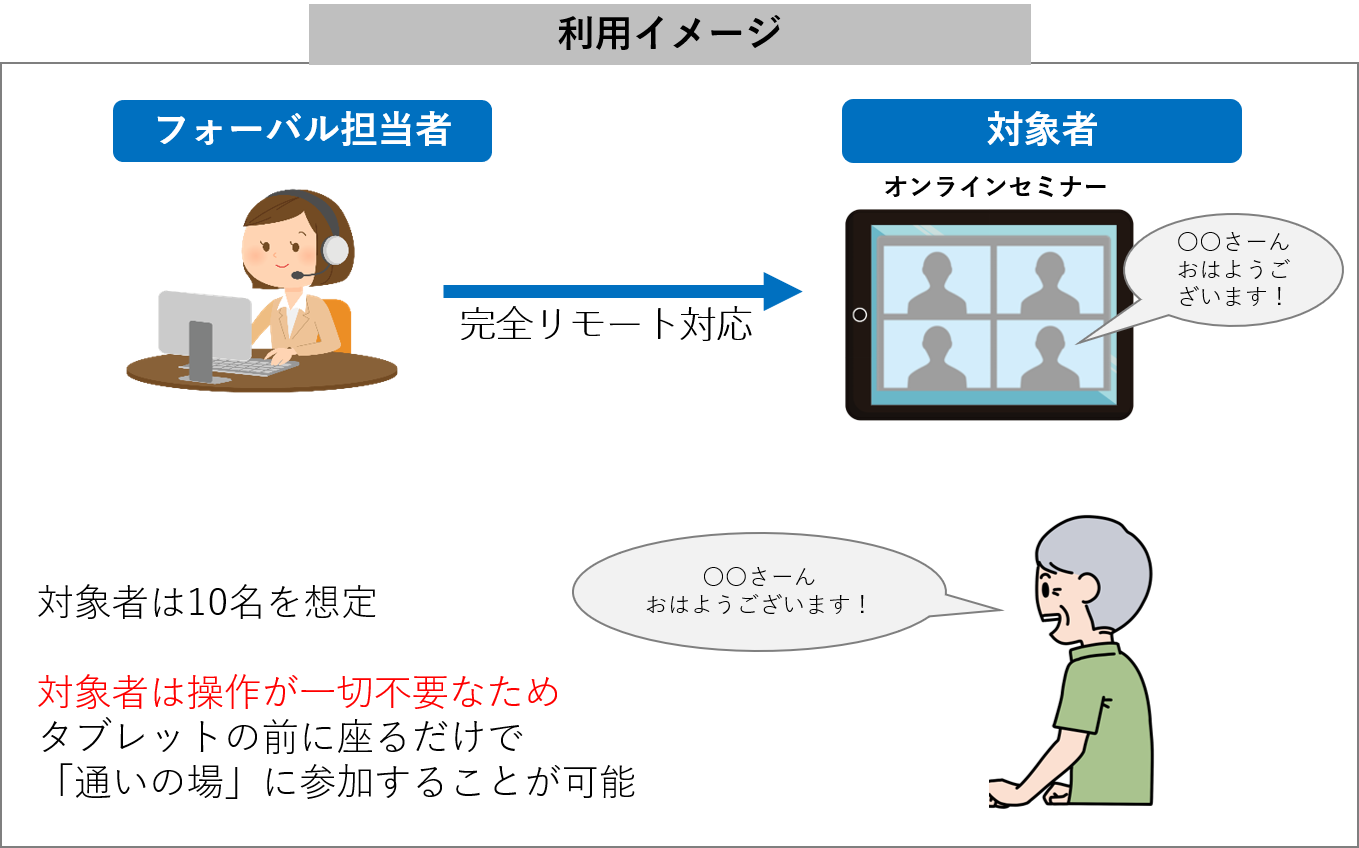 完全フルリモートシステムでタブレットを立ち上げる事を想定した「通いの場」への参加体験を開催予定。