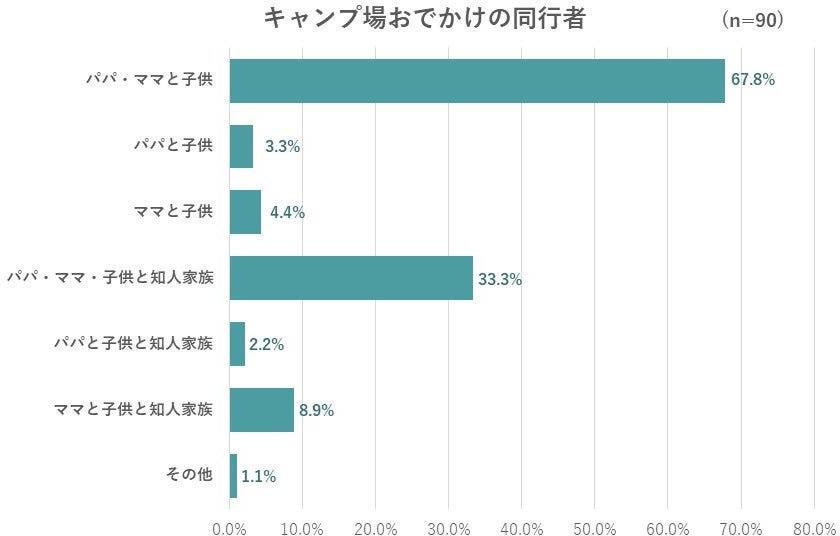 - キャンプ場おでかけは「パパ・ママ・子供」で訪れた家族が67.8%、「パパ・ママ・子供・知人家族」で訪れた家族が33.3%