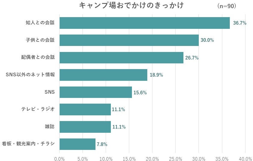 36.7%が「知人との会話」と回答。知人家族と一緒に行くという割合が3割程度いた事からも、今まで紹介した他のジャンルと比べて、知人との会話から一緒におでかけするパターンの多いジャンルと言えそうです。また、次点で「子供との会話」「配偶者との会話」が続く事から、キャンプは誰かとの会話がきっかけとなっておでかけを決める方が多いようです。