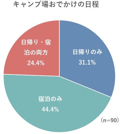 若干、「宿泊のみ」の割合が高く44.4%となりましたが、概ね3分する結果に。日帰りでも宿泊でも訪れた経験があると答えた家族が24.4%もいる事から、前述の通り全体としてキャンプ場経験のある家族の割合は低い一方で、一度でもキャンプに訪れた事のある家族は何度も遊びに行く、リピート率の高いでおでかけジャンルと考えられます。