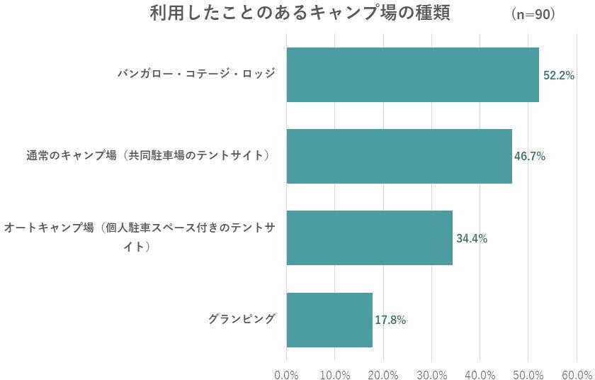 もっとも多かった回答が「バンガロー・コテージ・ロッジ」の52.2%。次点で「共同駐車場のテントサイト」で46.7%、そして「オートキャンプ場(個人駐車スペース付きのテントサイト)」が34.4%と続き、「グランピング」が17.8%でもっとも低くなりました。