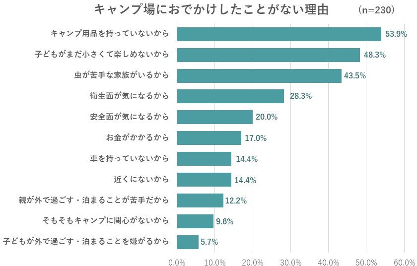 - キャンプ場におでかけしたことがない理由は「キャンプ用品を持っていないから」が53.9%と最多。その他「子どもがまだ小さいから」「虫が苦手な家族がいるから」が上位