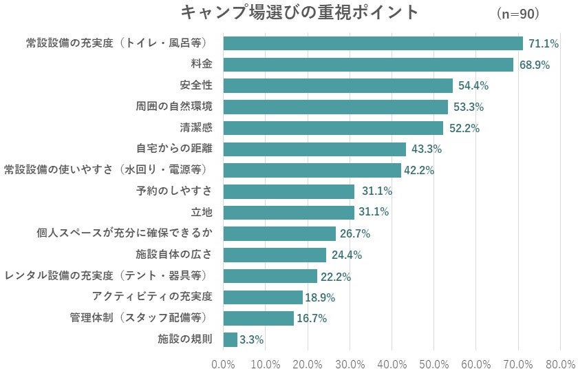 - 重視ポイントは「常設設備の充実度(トイレ・風呂等)」「料金」が7割と上位に。その他「清潔感」や「安全性」「周囲の自然環境」が半数以上