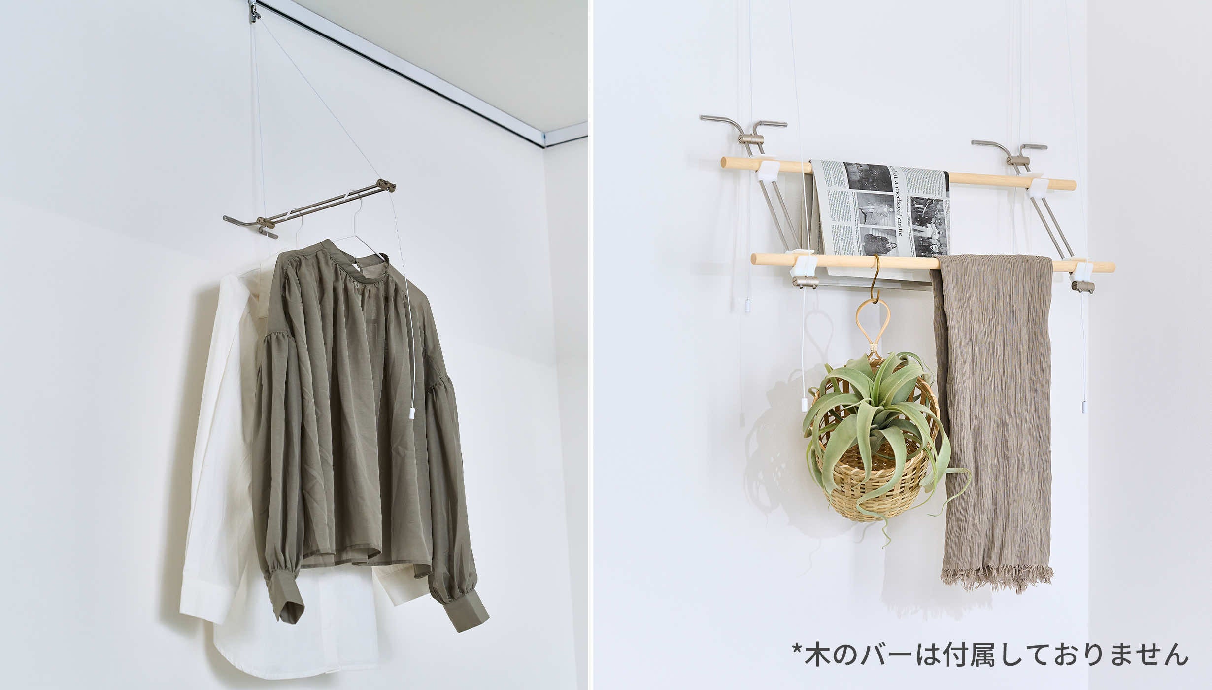 1本で使えば、ハンガーラックに。2本使って間にバーを通せば色々なものがかけられます。