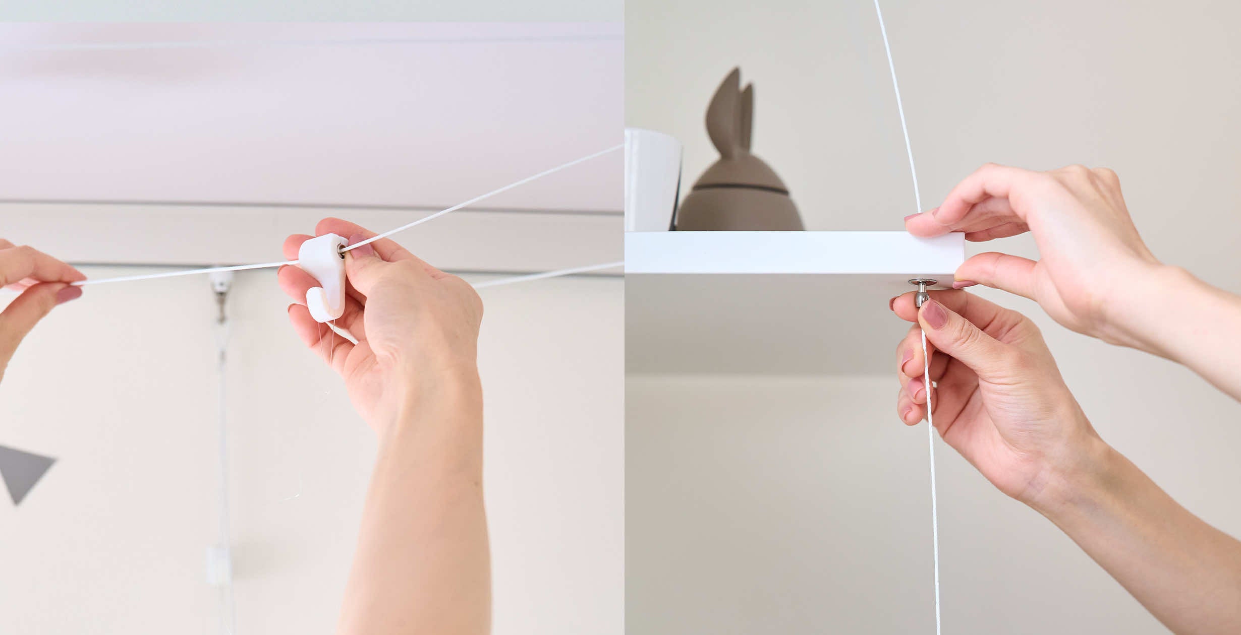 アタッチメントやフックは「つまむ」ことでワイヤーのグリップを解除し、自由に調節することができます。レール側のワイヤーの取り付け位置や、アクセサリー用フック・アイテムの取り付ける高さも手軽に細かく調整することができます。