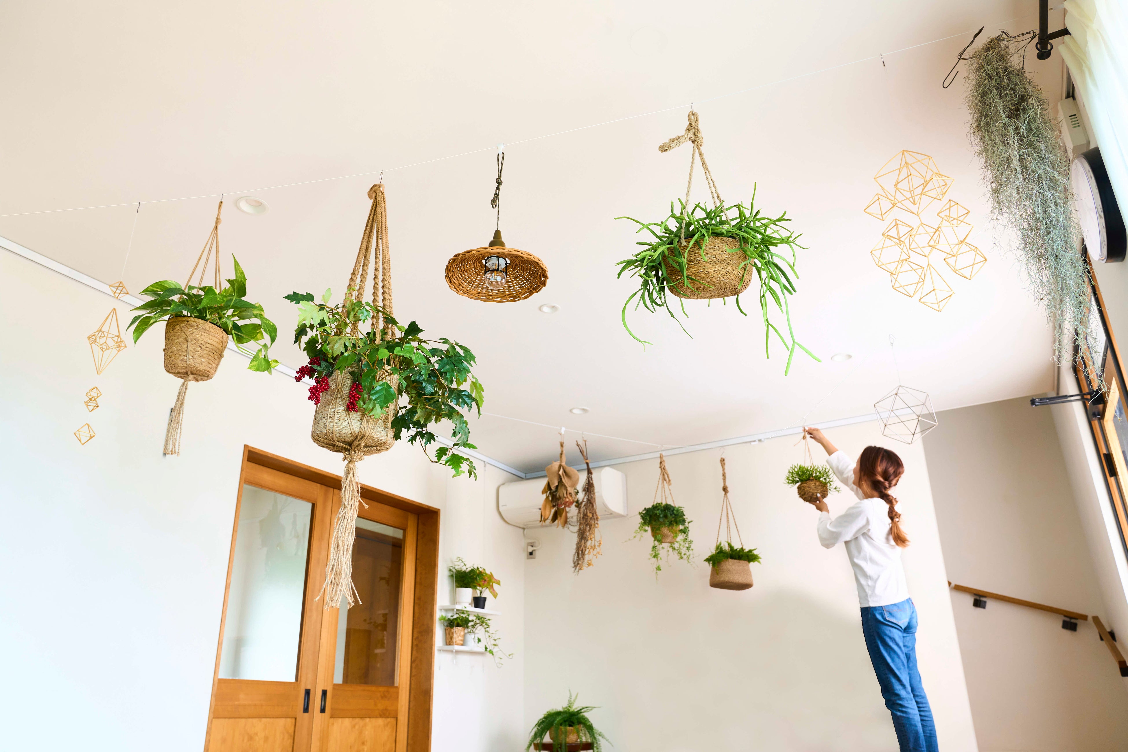 天井面には、レールに水平アタッチメントをつけてレール間をワイヤーで結ぶことができます。ワイヤーに水平用のアクセサリーフックを取り付けたり、市販のS字フックを利用して、植物やオーナメントなどを吊るし、様々なアレンンジができます。(ワイヤーの使用最長距離は3m、耐荷重3kg)