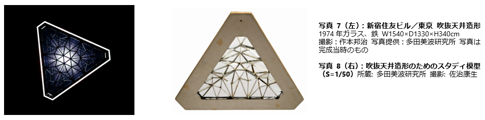 視覚的に動きを感じる、生きている立体をつくろうとした多田。ここでは、空間に馴染む静けさとともに、錯覚による動きを感じさせる作品を紹介します。「新宿住友ビル」にある三角柱の吹き抜け空間につくられた「光屋根」(吹抜天井造形)は三角形の多面体で構成され、いくつも模型をつくりながら形が決められました。写真7は天井から光が降り注ぎ、万華鏡のような様。その他、昼夜二つの顔をもつ「銀座Leeビル」のファサードデザインは、もはや建築家の仕事ともいえる作品です。