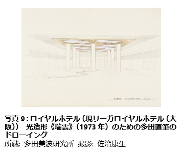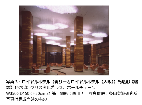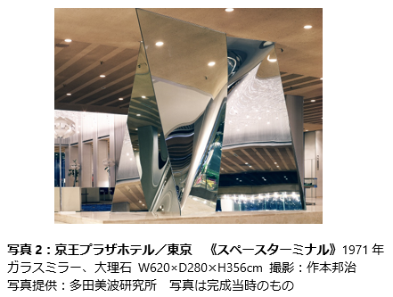 1960年代より頭角を現し、長く第一線で活躍した多田美波(1924-2014)。彫刻家として名を馳せた多田は、独立した立体造形のみならず、500もの作品をさまざまな建築空間につくりあげています。「帝国ホテル 東京」の色彩豊かな光壁、「リーガロイヤルホテル(大阪)」の光造形、「新宿住友ビル」の吹抜天井造形など、反射や透過といった「光」の性質を取り入れた独自の表現で空間を新たな次元へと導こうとしました。そのために、アルミニウム、ステンレス、アクリル、ガラスなど当時の新素材に技術を掛け合わせ、大胆に発想し、緻密に考え抜くことで、優美で二つとない世界を実現させていたのです。