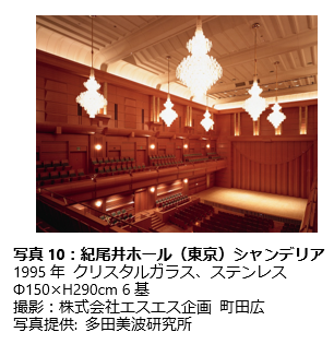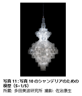 ガラスや金属の内に潜む光源は、反射し、連なり、見えない分子の集まりである空間に方向性と形をつくりだします。ここでは主に照明の機能をもつ作品とその制作過程の一部を紹介します。「リーガロイヤルホテル(大阪)」の《瑞雲》(写真3)は日本庭園をイメージしたラウンジのためにつくられた光造形で、雲のイメージを小さなガラスの集合体で表現しました。また「紀尾井ホール」(東京)のホールを飾るシャンデリアは多田が雪の結晶を表現したものです。781枚のガラスがいくつも重なり合っています。ドローイング、ガラスのパーツ、模型などの展示から、光の反射効果を引き出す工夫などが見て取れます。
