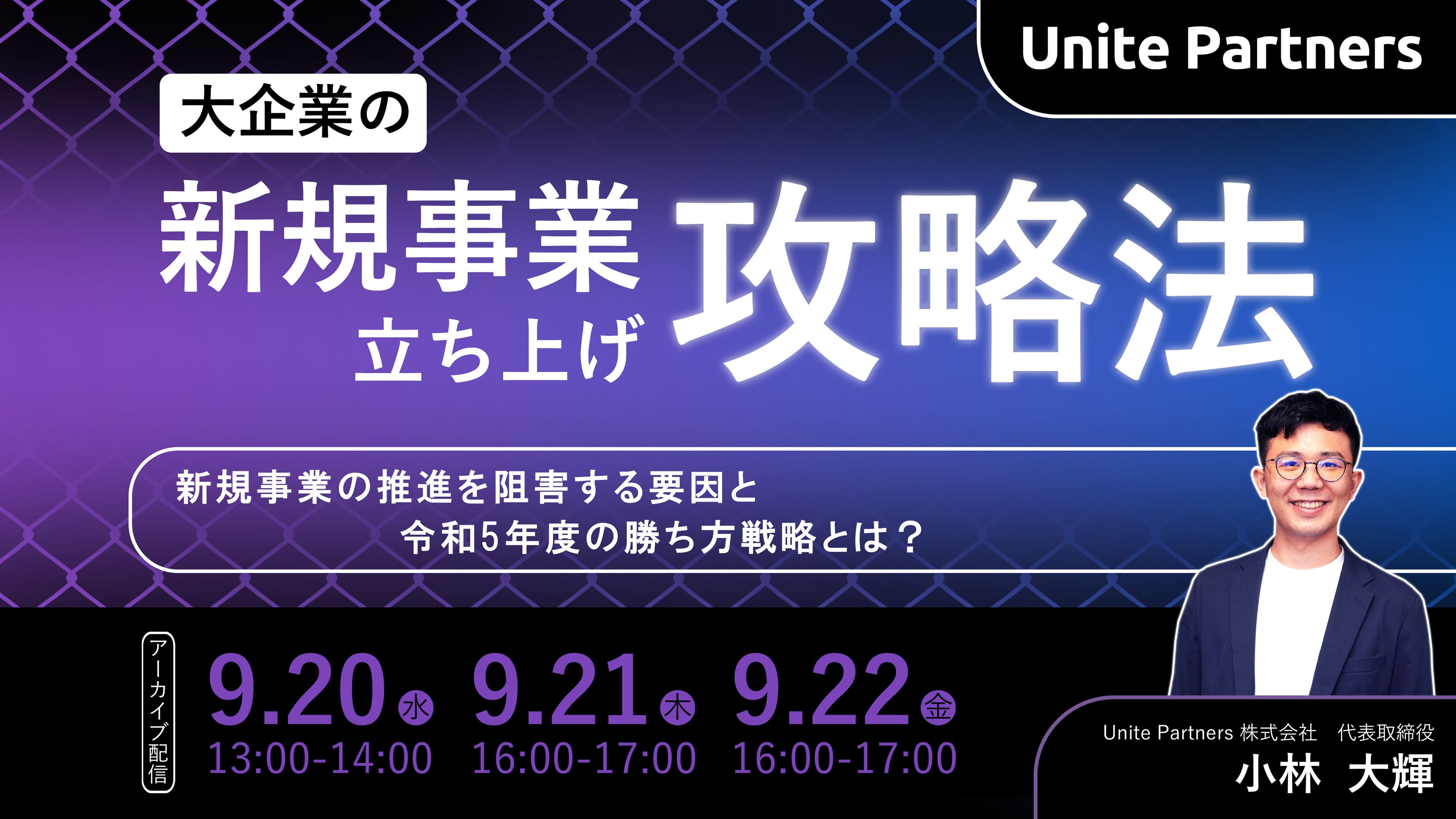 企業の変革パートナーを目指すブティック型コンサルティングファームのUnite Partners株式会社(本社:東京都、代表取締役:小林大輝)は、2023年9月20-22日に、「大企業の新規事業立ち上げ攻略法〜新規事業の推進を阻害する要因と令和5年度の勝ち方戦略とは?〜」と題して大企業の新規事業担当者向けのセミナーを開催します。(5月11日(木)開催セミナーのアーカイブ配信となります。)