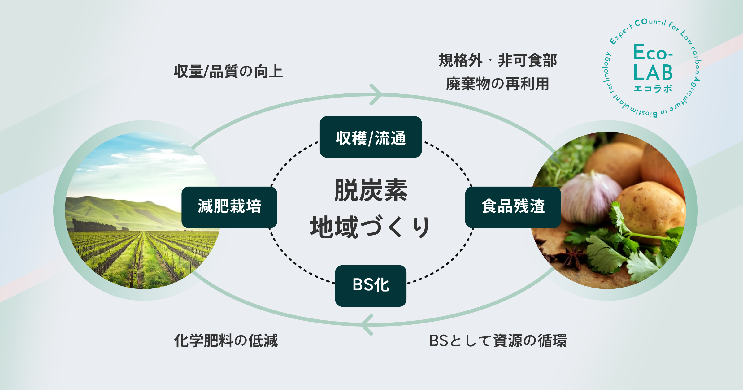 Eco-LAB(エコラボ)協議会|バイオスティミュラントによる脱炭素地域づくり協議会 脱炭素地域づくり協議会(通称Eco-LAB・エコラボ)は、産地が持つバイオスティミュラントの利用課題や、生産現場の問題意識に対する政策提言をまとめ、産地の発展に貢献することを目標に活動しています。 |
