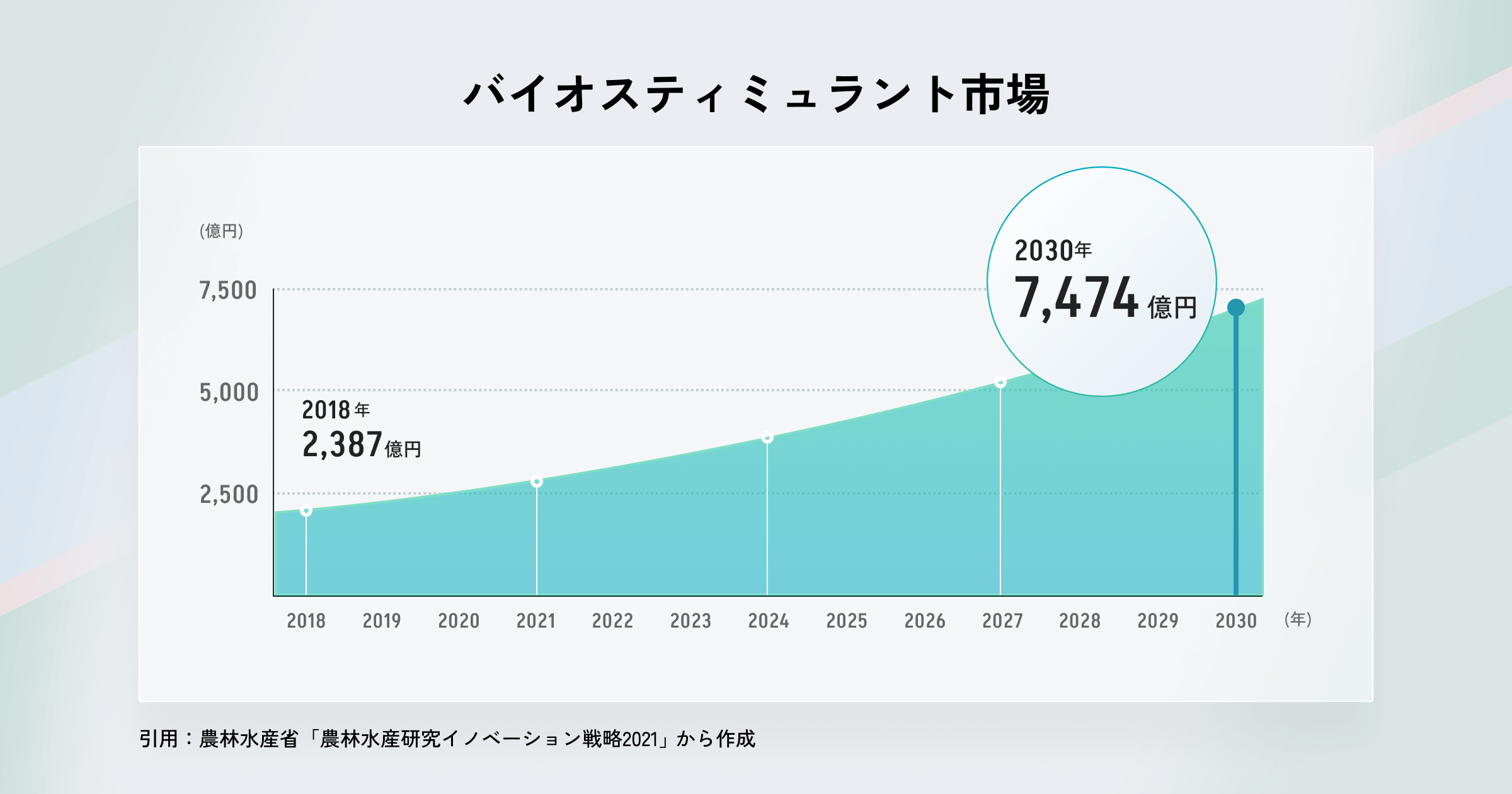 バイオスティミュラントは、「作物の活力、収量、品質および収穫後の保存性を改善する資材」として期待されており、2030年に約7500億円のマーケットとして注目されている新しい農業用資材です。気候変動によるストレス耐性に寄与し、植物の免疫系を活性化することで、根張り・収量の向上や、乾燥/過湿耐性、耐病性、耐⾼/低温性、耐塩性といった効果をもたらし、栄養吸収の強化に効果のある資材も確認されています。そのため、生育状況を考慮しながら利用することで、過剰な化学肥料の使用を抑えた事例もあります。
