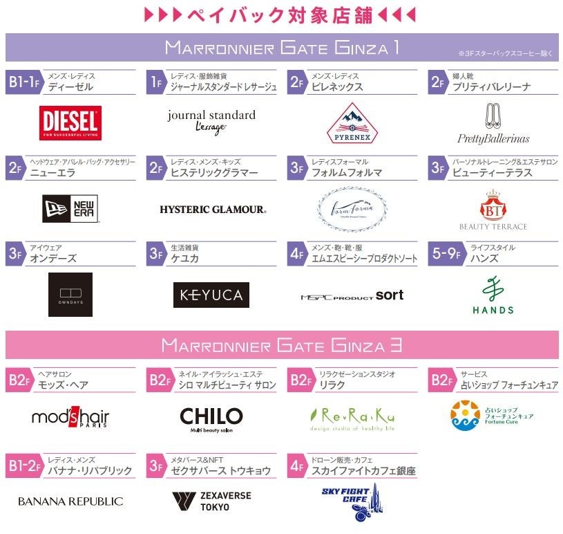 マロニエゲート銀座1 B1F~9F全店舗(3Fスターバックスコーヒー除く)