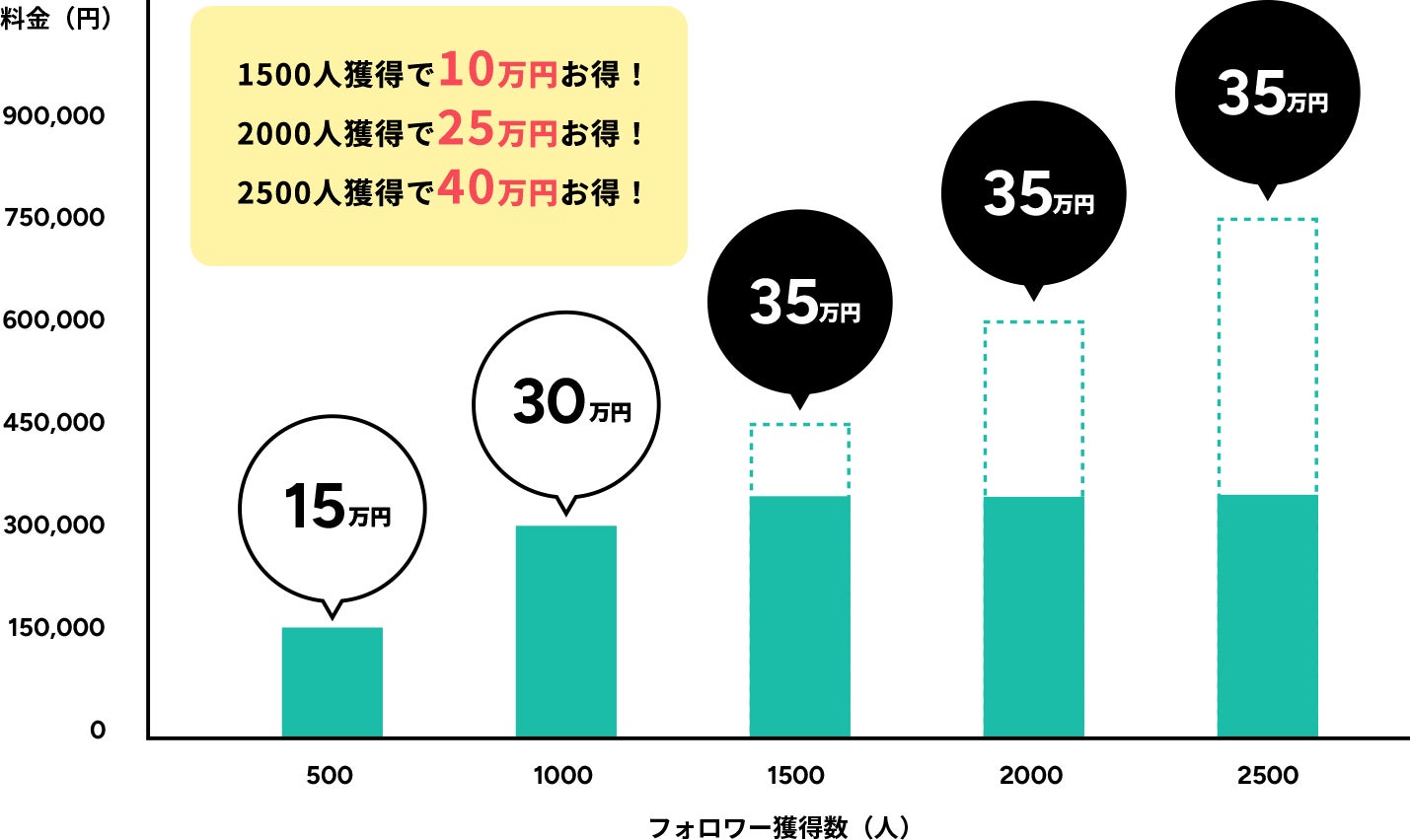 フォロワー数の増加に応じて、お客様に費用が発生します。効果がなければ、お支払いいただく必要はありません。さらに上限金額は35万円を基準としているため、どれだけフォロワーが増えても、上限35万円以上の料金は発生しません。