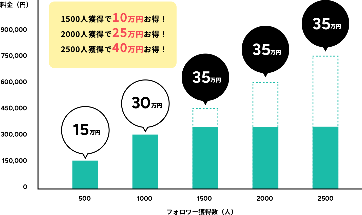 フォロワー数の増加に応じて、お客様に費用が発生します。効果がなければ、お支払いいただく必要はありません。さらに上限金額は35万円を基準としているため、どれだけフォロワーが増えても、上限35万円以上の料金は発生しません。