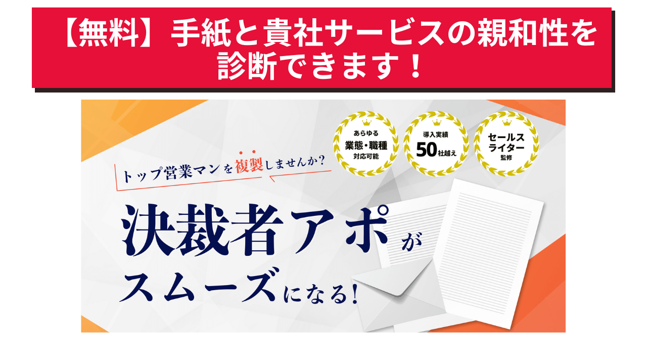 手紙営業で決裁者アポを獲得できるかどうか?が、無料で診断可能な内容です。
