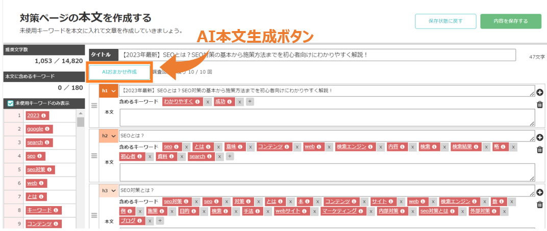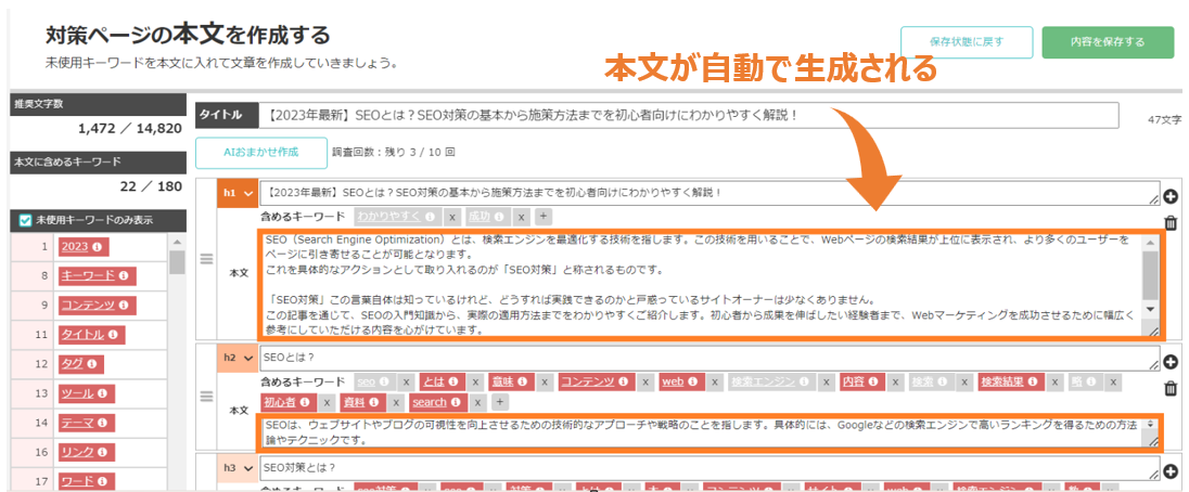 現在Googleの検索上位にあるページの内容をAIが分析し、記事内容を作成するため、検索ユーザーのニーズにマッチした記事作成ができるようになります。
