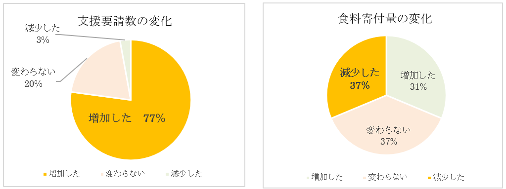 プロジェクト終了後のアンケートに回答した団体のうち、77%の団体が食料支援の要請件数が増加したと回答しました。また、食料寄付量が減少したと37%の団体が回答しています。