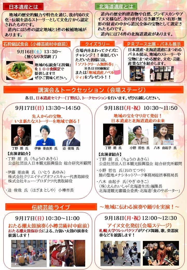 遺産の魅力が分かるPRブースや有識者による講演会&トークセッション、「おたる潮太鼓」や「アイヌ舞踊」による迫力満点の伝統芸能ライブ、ブイヤベース仕立てにアレンジした石狩鍋の試食会、参加賞がもらえるクイズラリーなど、誰でも楽しめる内容です。