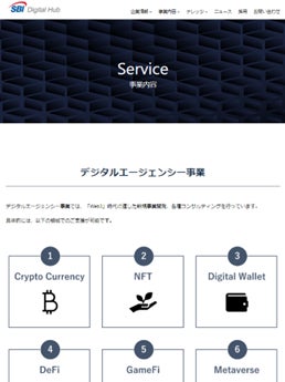 SBIデジタルハブ株式会社 Web3・DXのトータルコンサルティング DX及びWeb3に関連した新事業開発・立上げや事業推進に関する各種コンサルティングサービスを、Web3の様々な領域に強みをもつアライアンスパートナーと協働して提供します。 |