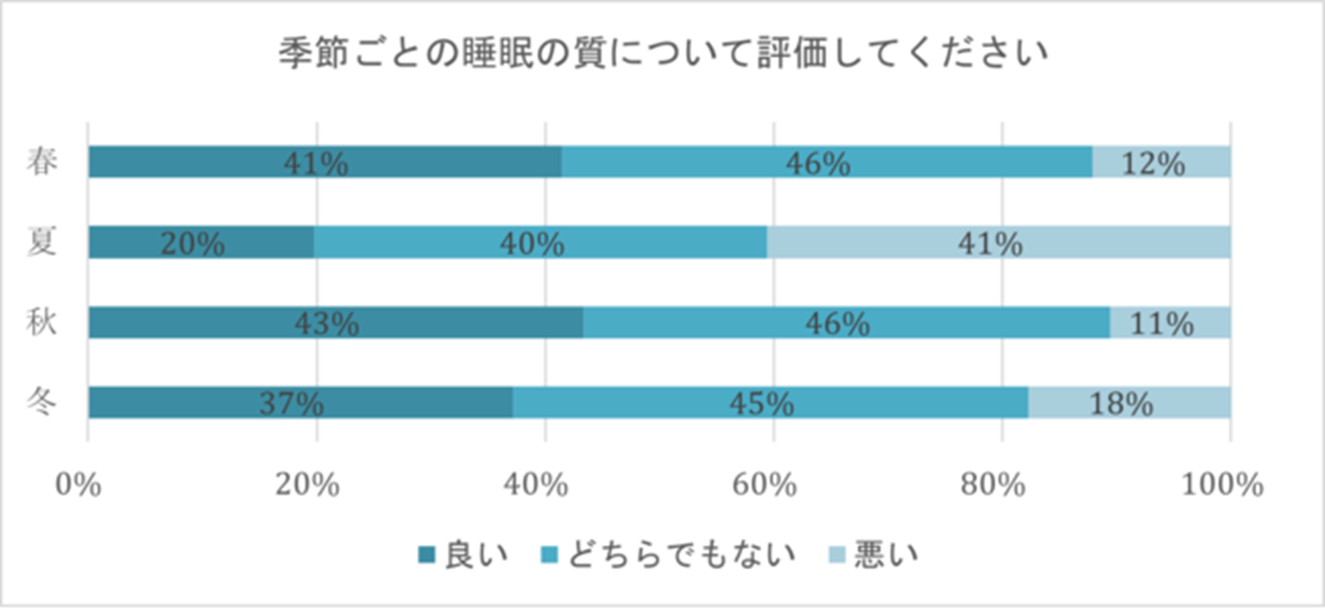 本年は歴史的猛暑が連日ニュースになっており、電気代の高騰などでエアコンを付けず、夜中に熱中症になるなど夏における睡眠において日々話題になっております。コアラスリープジャパン株式会社が18歳から70歳の1055名を対象とした「2021年夏の睡眠意識調査」においても「季節ごとの睡眠の質」についての質問に対し、約41%の方が夏の睡眠の質が悪いと回答をしております。(春12%、秋11%、冬18%)