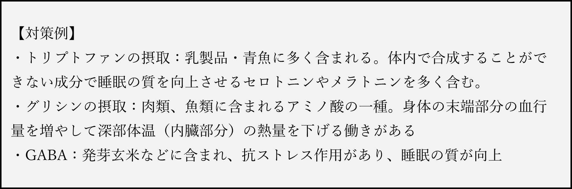 睡眠の質が低下する原因は多数ありますが、一般的によく言われるものに「体温」「食事」「ストレス」の3つがあげられます。