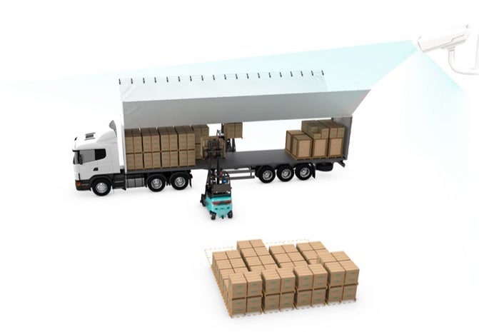 ①トラックの自動積み降ろし:本体に搭載したカメラのみで、トラックの位置ずれが±50cm、角度ずれが±5°に対応、さらに天眼システムを使用すると、トラックの位置ずれが±1m、角度ずれが±10°にも対応可能。