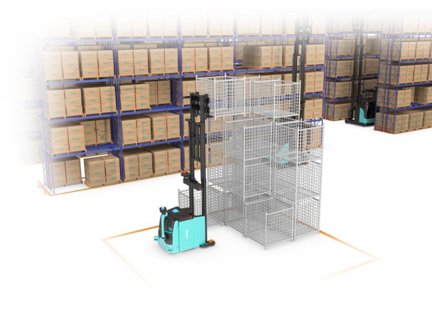 ⑥天空ナビゲーション:移動ラックなどLidarで壁や柱などの景色を見ることができない環境、あるいはその環境がラックの移動により激しく変化する場合、天井に反射板やQRコードを付けることで上部空間を使ってナビゲーションが可能になり、狭い通路でも荷役できるKシリーズの製品との組み合わせで簡単に立体倉庫を構築することも可能です。