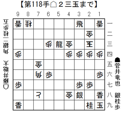 △4三金 ▲3一飛 △2三玉 まで118手で後手の勝ち