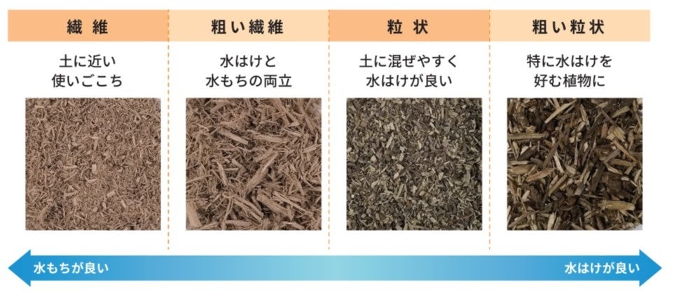 原料である木材チップの形状を変えることで、水はけ・水もちがコントロールできます。これにより、栽培する植物に最適な栽培環境を選択できます。