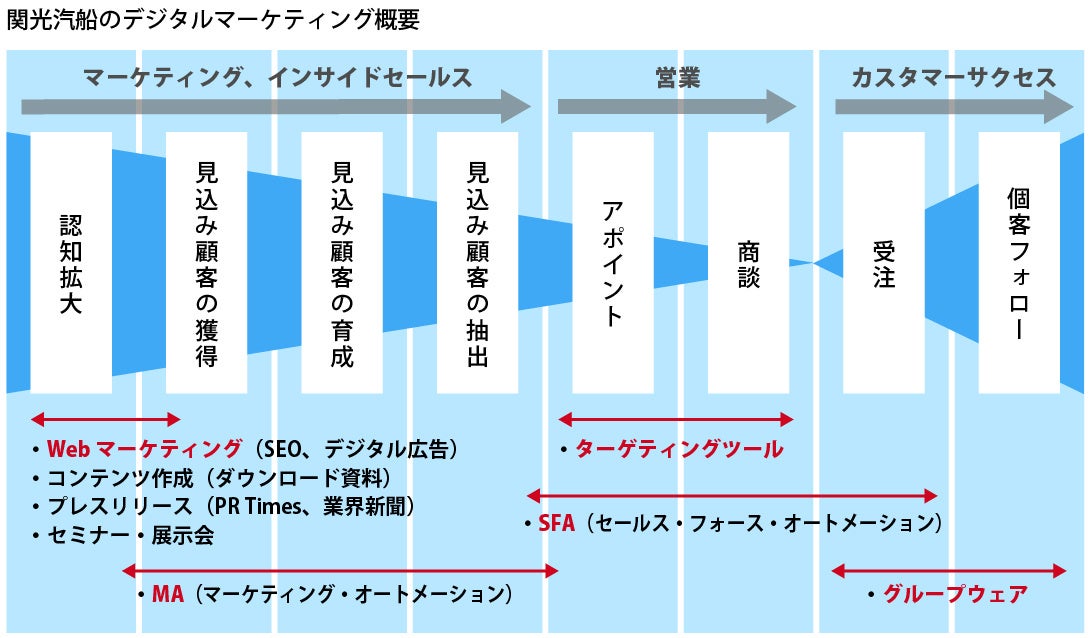 ・関光汽船は、外部コンサル会社とともに、ウェブサイトを刷新し、アクセス解析に基づくSEO対策や、サービス資料や課題解決資料などのコンテンツの作成・充実を行うことで、認知拡大とリード拡大を推進しています。